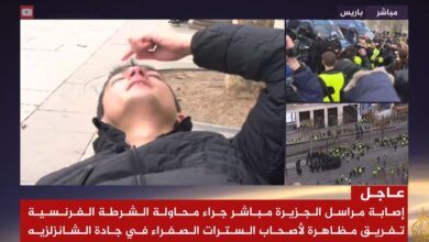 أصيب مراسل الجزيرة مباشر في باريس محمد الرماش أثناء تغطيته أحداث العنف الدائرة بين قوات الشرطة ومتظاهري “السترات الصفراء”. وأظهرت كاميرا الجزيرة مباشر، الرماش،بعد إصابته جراء استنشاقه الغاز المسيل للدموع الذي أطلقته الشرطة بكثافة على المتظاهرين، قبل أن يقوم بالتحرك من مكانه والاستلقاء ثم استنشاق الخل في محاولة للتغلب على…